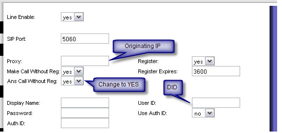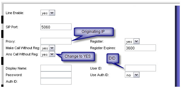 4B. For SIP Username/Password authentication, From factory default, you will need to change the following fields: