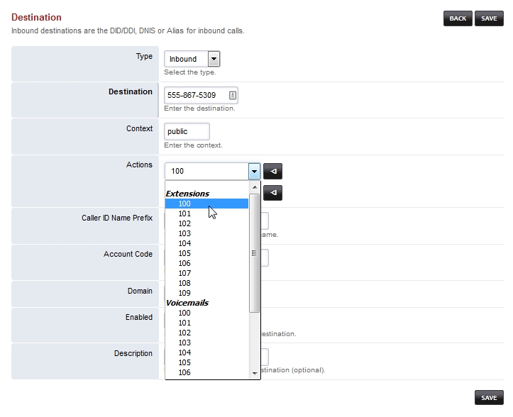 In the example above, when someone calls the phone number (DID) 555-867-5309, the call will be forwarded to extension 100.